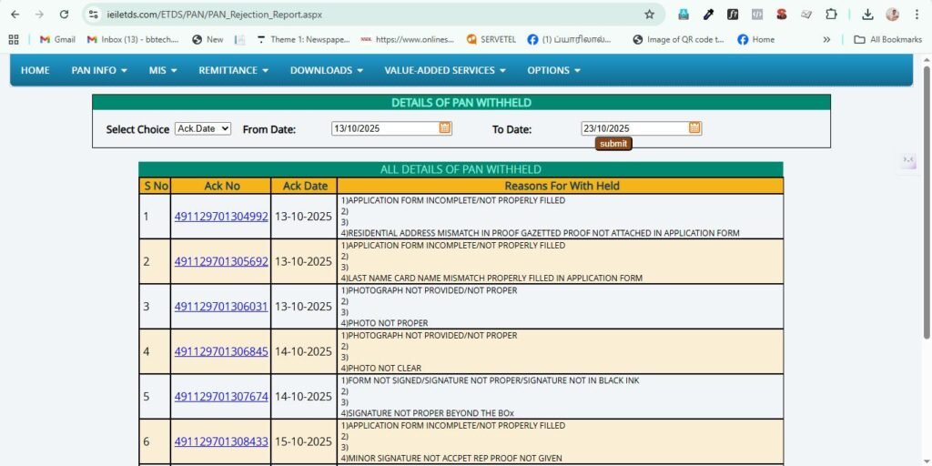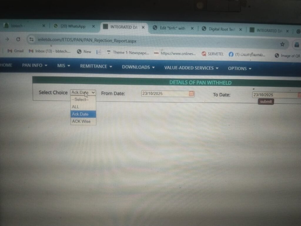 After clicking Visit https://www.ieiletds.com/ETDS/PAN/PAN_Rejection_Report.aspx , it will take you below page. here bot need to select the button “Select Choice”- and select -Ack Date.Both from and to date will show the current date by default.Bot need to change the From date as 10 days before date.dont touch the To date. Example today is October 23.When bot click Select Coice then Ack Date, By default both From and To date will show the current date as 23/10/2025 by default. The bot should change the From date as 13/10/2025/.Then click on submit button below the To date.