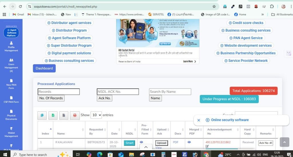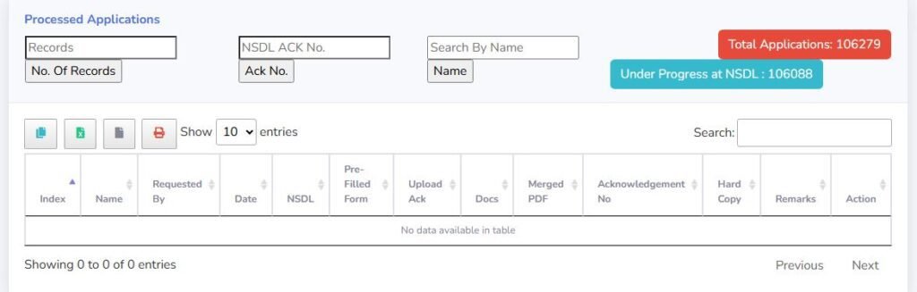 To find the applicant name and batch number the bot need to copy the Ack number frm the sheet first. The ack number may be New pan or correction pan. So first bot need to open the new application list. the new all application list url is https://ssquickseva.com/portal/c/nsdl_newapplied.php Correction application list url is https://ssquickseva.com/portal/c/nsdl_csfapplied.php . The bot first open the New application list url and check whether it is new pan application . see the new application list screenshor below. In the center you can see a box(placeholder:NSDL ACK No) named Ack no. You need to paste the 15 digit collected ack number from the excel sheet and click Ack No Button.